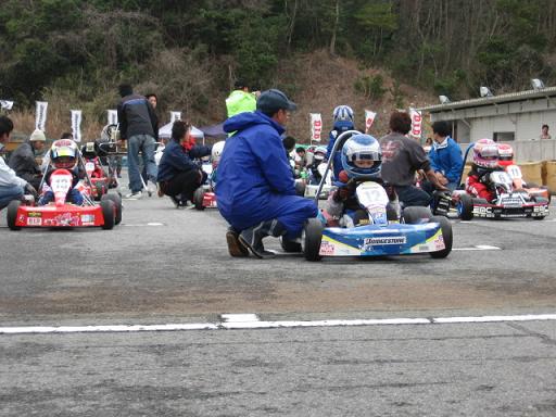 チームよりMITUKIくん(birel32)&HAMAちゃん(birel31)と若手・ベテランの2台体制で望んだこのクラス、一日を通じて目まぐるしく変わる路面状況。公式練習・タイムアタックと路面はウェット。MITUKIくん3番手、HAMAちゃん10番手タイムを計測、予選はドライ、3番手スタートのMITUKIくんスタートで出遅れ5番手に後退するがすぐさまポジションを上げ4番手でフィニッシュ。一方HAMAちゃんスタートを決め6番手にポジションを上げる。7コーナーでインに飛び込んだ、そのインにまだ他のマシンがねじ込んでくる3台並んで立ち上がって来たがサンドイッチ状態のHAMAちゃん失速してしまいごぼう抜きされ再び10番手に後退、その後1台抜き去り9番手でフィニッシュ