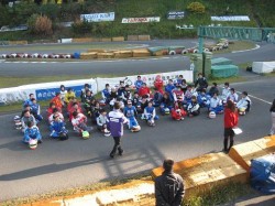 スタート前、レースクイーンのおねーさんがスタート準備の合図、気合が入る瞬間・・・その数秒後には押しがけ合戦を
