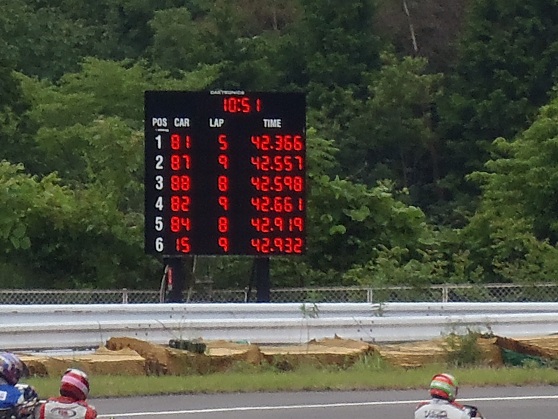 タイムアタックでは真っ先にコースイン・・・・タイヤの皮むき後クリアラップでタイムアタック開始、その後ペースを落とし集団の背後で再びタイムアタック 電光掲示板に1stタイムを刻む