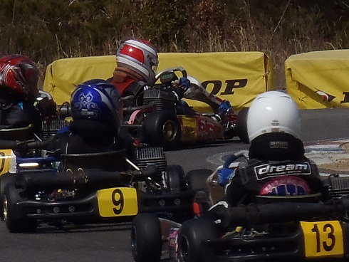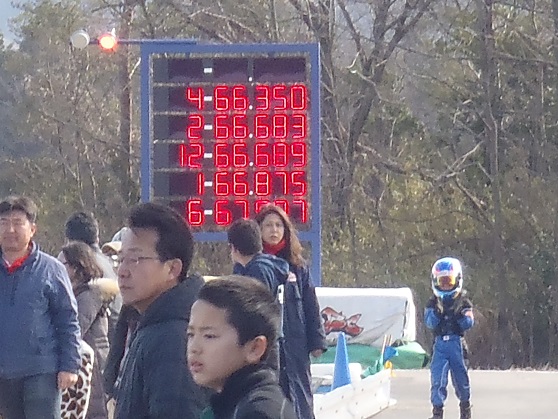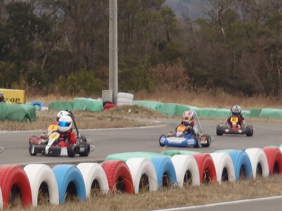 午後からの決勝ヒート、路面の水溜りもなくなり、完全ドライ9番手スタートのHIDEくんオ-プニングラップは10番手でホームストレートを駆け抜ける。14番手スタートのSHOTAくんスタートは学習していい加速で1コーナーでポジションアップその後の2コーナーでインに入れなかったとコメントの再び元のポジションに、レース中盤には5番手争いの集団にHIDEくんが加わり現在9番手、焦ったかブレーキロックの数台で失速、大きく順位を落とす、その背後にいたSHOTAくんこの集団の後方に追い付きポジションアップ、その後、共にはじけたレース展開に終わって見ればHIDEくん11番手、SHOTAくん13番手フィニッシュとなりました。