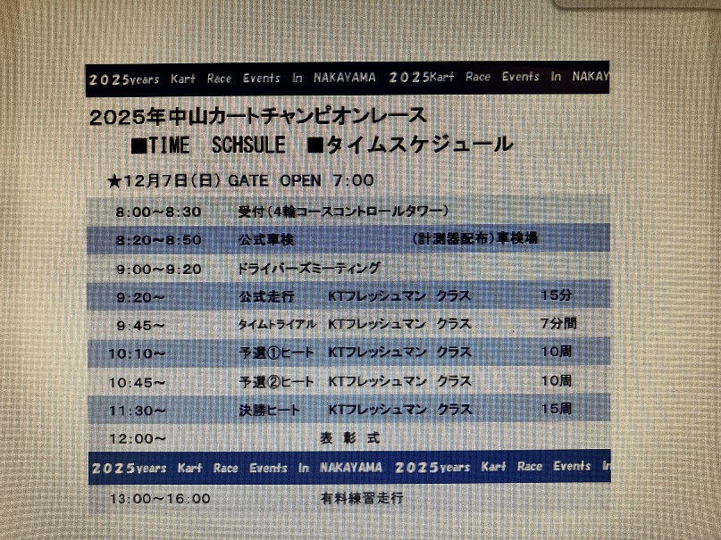 12月に入り最初の週末は、岡山県・中山サーキットにて、カート体験走行&レース前日チーム練習会のサポートをさせて頂きました。。。。朝方の気温は、マイナスと、トランポのフロントガラスも凍る程(寒)しかし日中は、風もなく最高のカート日和と、明日に向けパーツの搬入、準備をさせて頂きました。