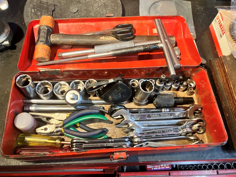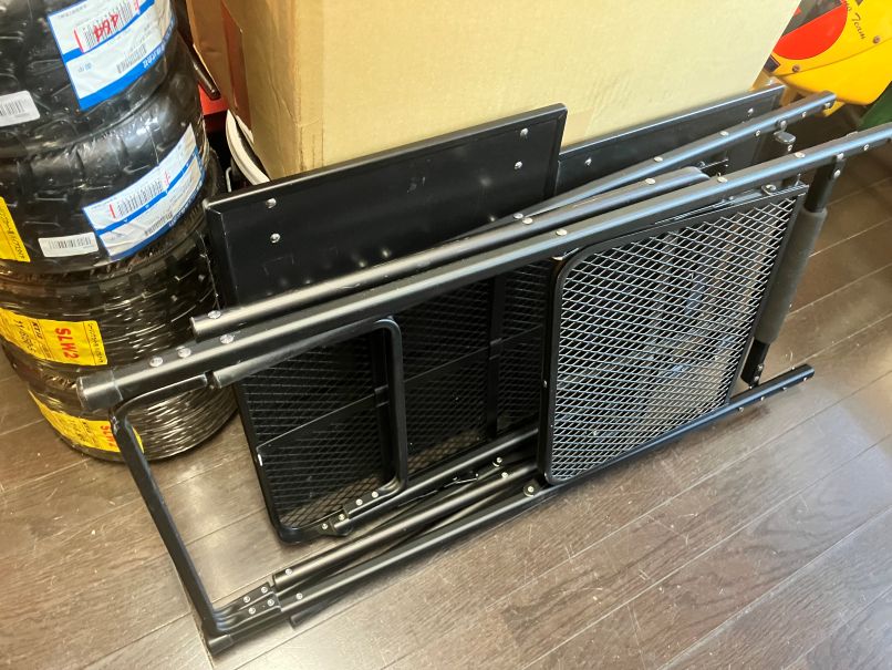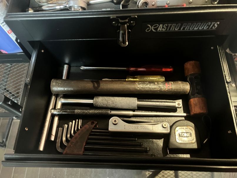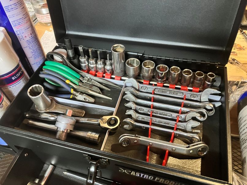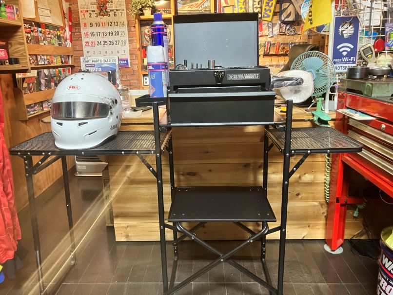 今まで、ご愛用のTOOL BOXが小さく、工具を探すのが大変とワンサイズ大きめの2段収納工具箱をチョイス、工具台にはアウトドア用の折り畳み式のものが、丁度ピッタリ!ヘルメット置き場や、小物の収納も出来、スマートに作業が出来そうです。
