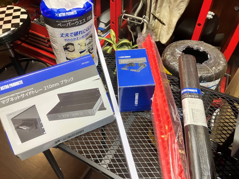 工具箱の中は、ホルダー&仕切り版を付け、一目で工具が分かるように。ケミカル置きとぺーパーウエスホルダーも備えました。