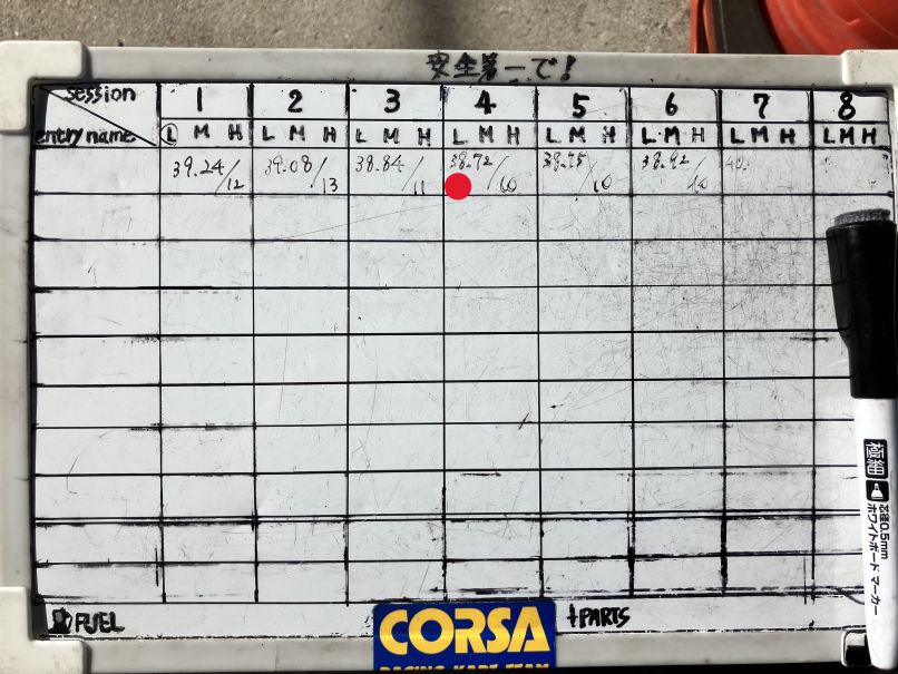 チーム練習会は、KTクラスレジェンドTUKAさん、久々の走行に ”カート楽しー” と肩慣らし走行。SORAIくんは、エンジン慣らし走行からの初心者先導からの最後は、本気走りに好タイムをマーク。